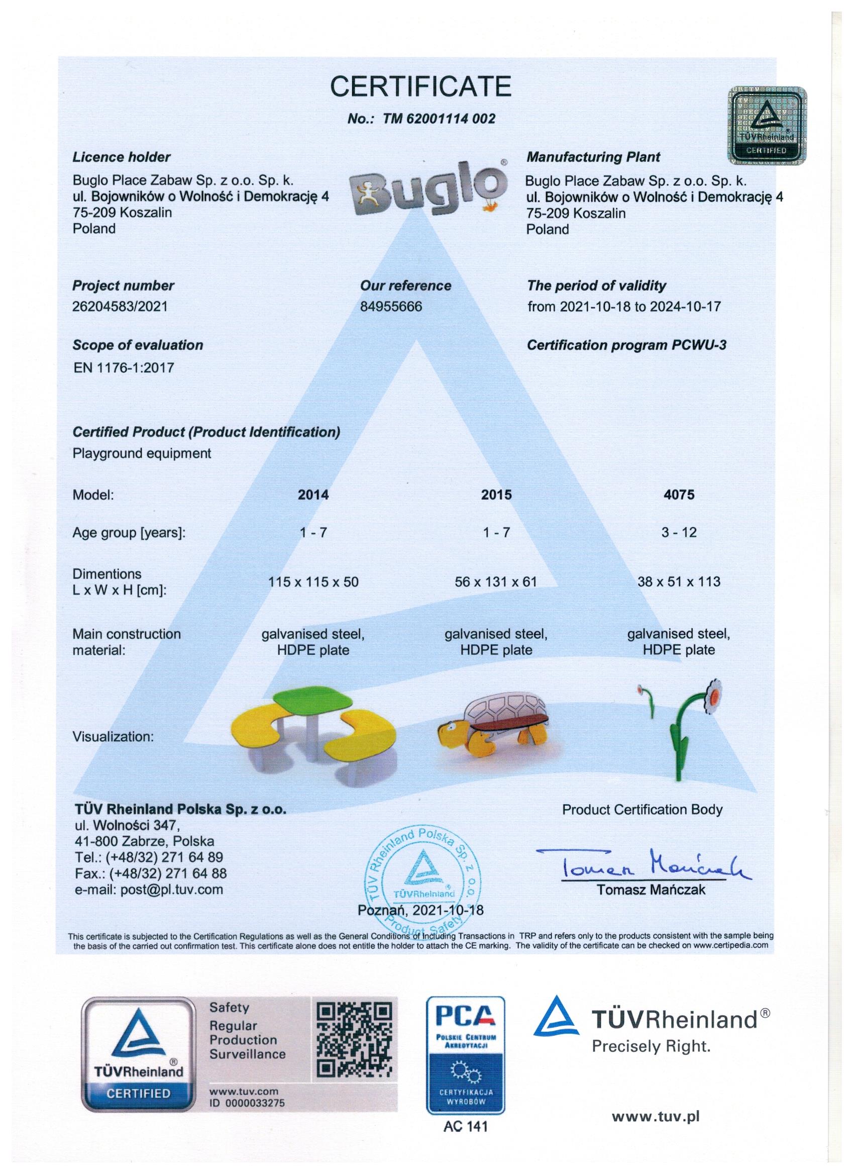 Toate echipamentele de recreere și de joacă trebuie să dețină certificate de conformitate cu seria de standarde EN 1176 – Echipamente și suprafețe pentru spații de joacă, (în cazul echipamentelor de fitness și street workout, standardul este EN 16630:2015).