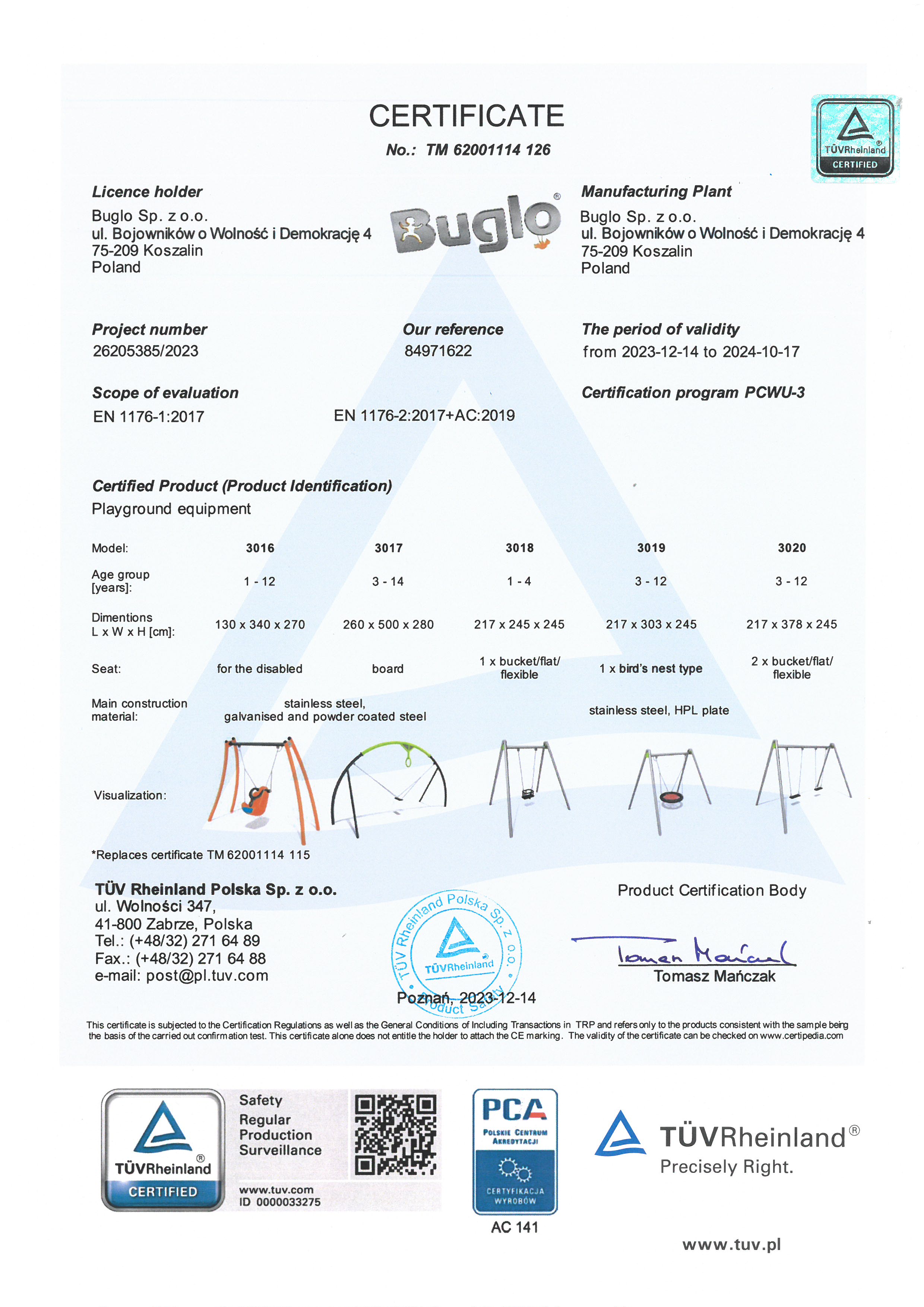 Toate echipamentele de recreere și de joacă trebuie să dețină certificate de conformitate cu seria de standarde EN 1176 – Echipamente și suprafețe pentru spații de joacă, (în cazul echipamentelor de fitness și street workout, standardul este EN 16630:2015).
