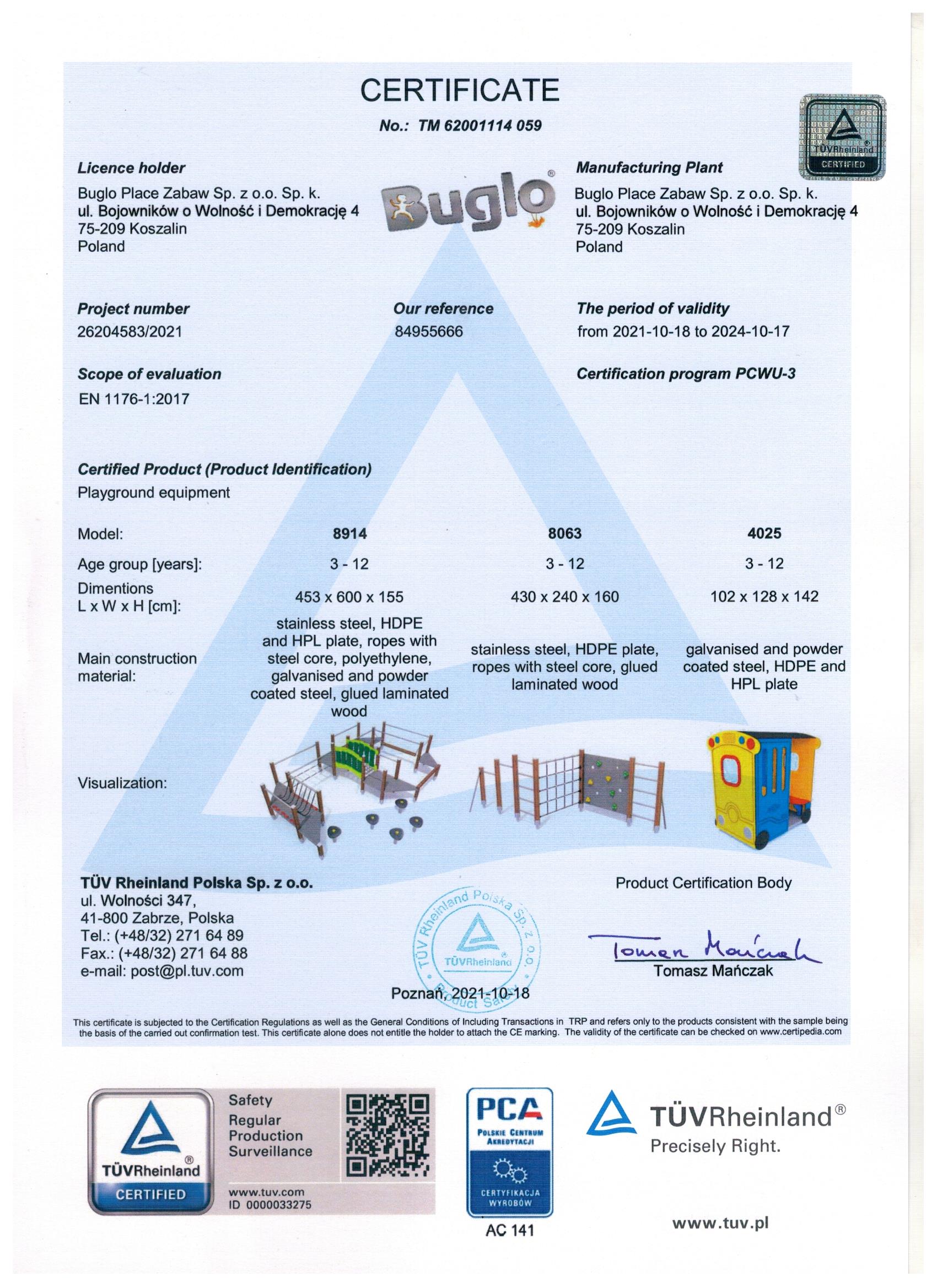 Toate echipamentele de recreere și de joacă trebuie să dețină certificate de conformitate cu seria de standarde EN 1176 – Echipamente și suprafețe pentru spații de joacă, (în cazul echipamentelor de fitness și street workout, standardul este EN 16630:2015).