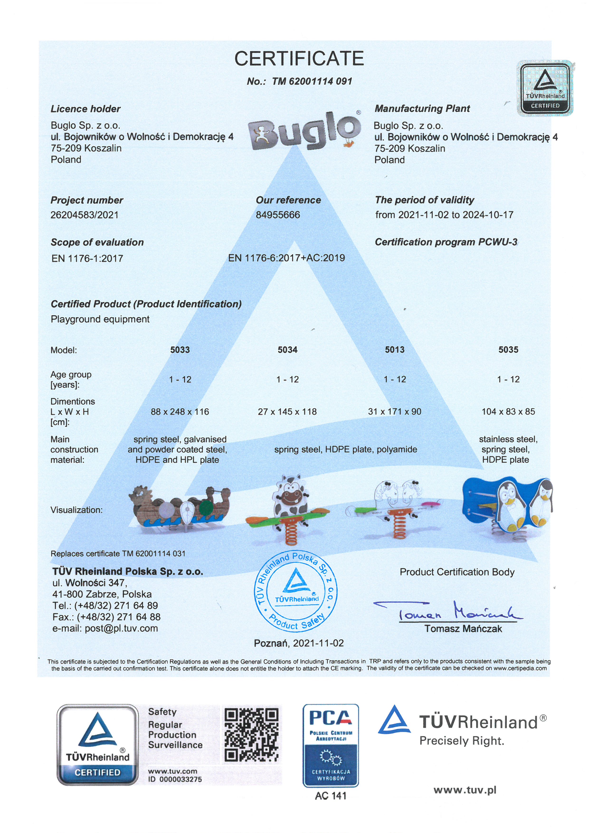 Toate echipamentele de recreere și de joacă trebuie să dețină certificate de conformitate cu seria de standarde EN 1176 – Echipamente și suprafețe pentru spații de joacă, (în cazul echipamentelor de fitness și street workout, standardul este EN 16630:2015).