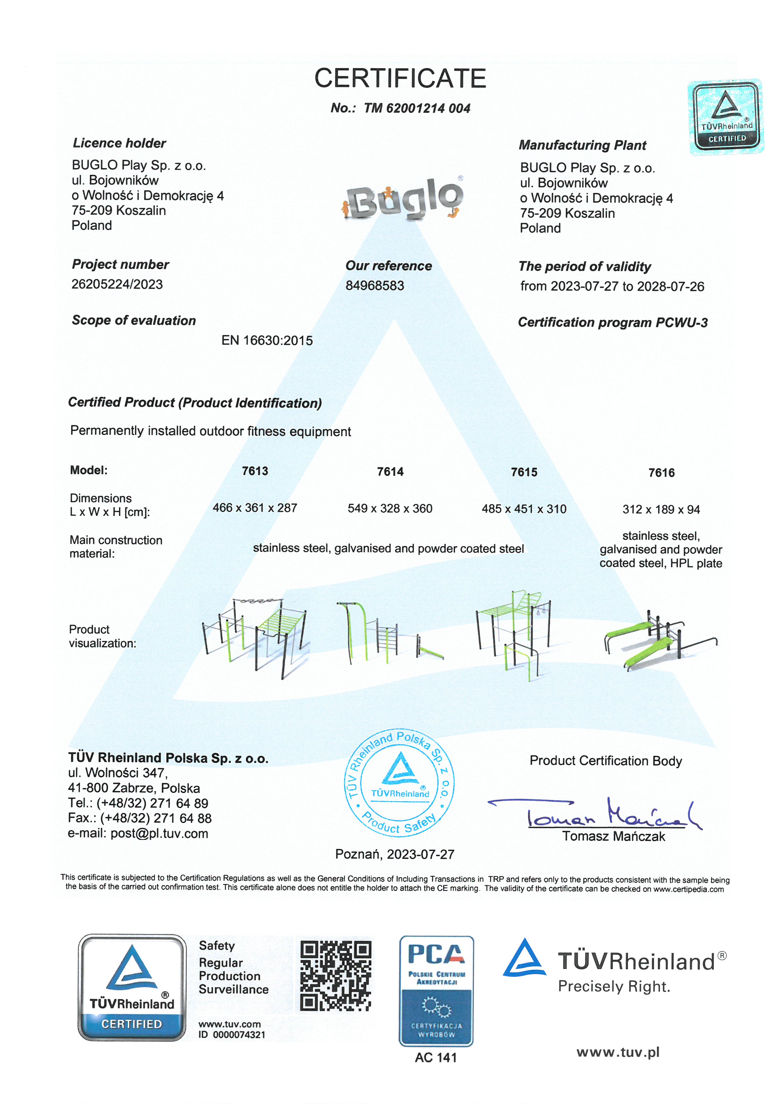 Toate echipamentele de recreere și de joacă trebuie să dețină certificate de conformitate cu seria de standarde EN 1176 – Echipamente și suprafețe pentru spații de joacă, (în cazul echipamentelor de fitness și street workout, standardul este EN 16630:2015).