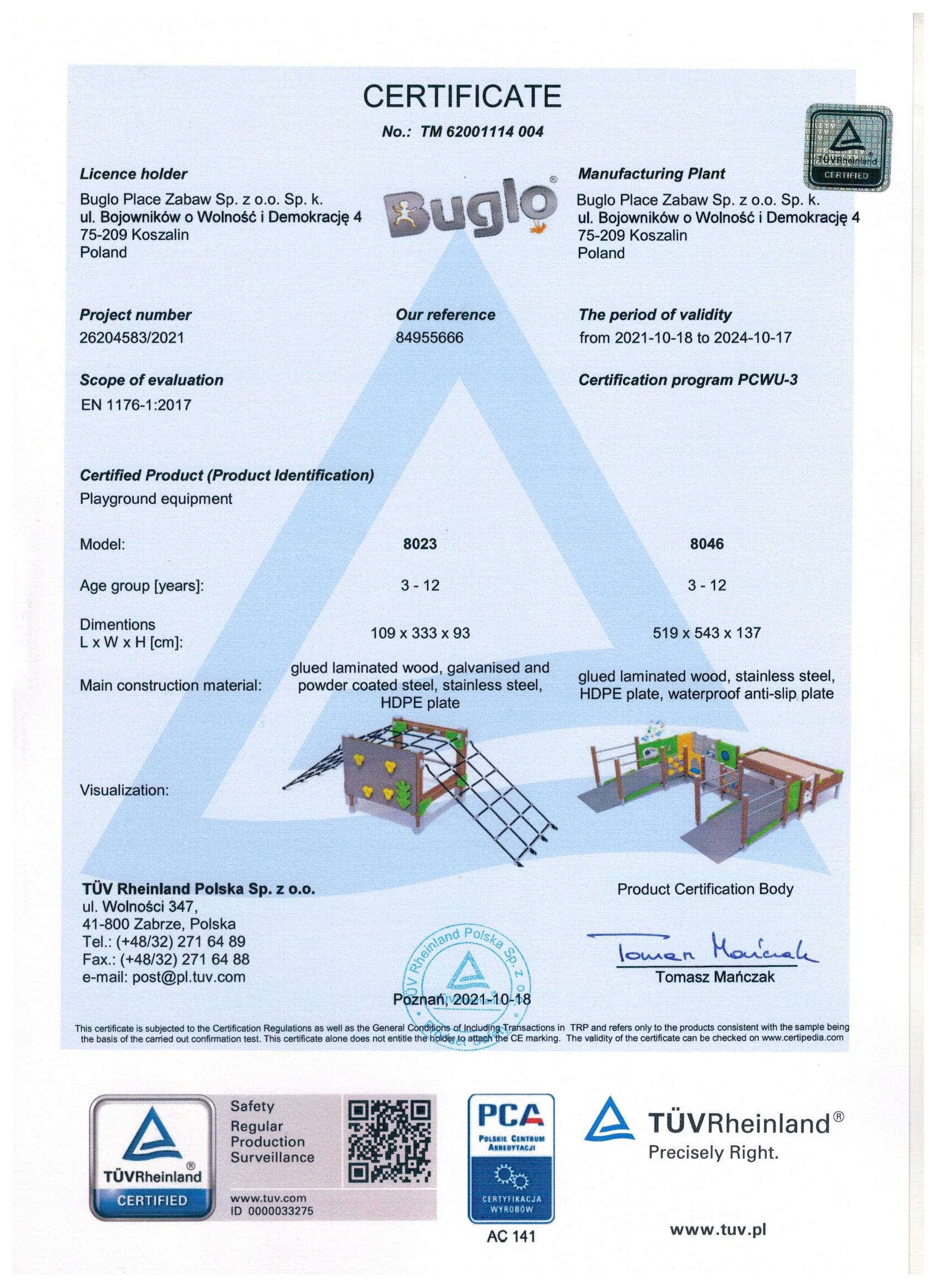 Toate echipamentele de recreere și de joacă trebuie să dețină certificate de conformitate cu seria de standarde EN 1176 – Echipamente și suprafețe pentru spații de joacă, (în cazul echipamentelor de fitness și street workout, standardul este EN 16630:2015).
