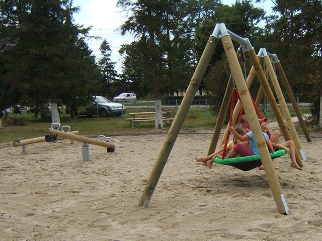 | Echipamente montate: | Hintă dublă LK07.01.032 Hintă cu leagăn cuib LK07.08.160 Balansoar din lemn LK02.01.010 | Bârnă rotundă LK12.05.020 Masă de picnic LK14.02.120 Tobogan LK25.04.102 |
