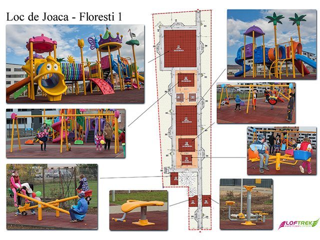 Descrierea lucrării:Parcul Teren Sport din Floresti, combina cu succes echipamentele de joaca multifunctionale cu echipamentele de fitness. Lucrarile au inceput cu decopertarea, apoi s-a trecut la umplerea si nivelarea terenului si mai apoi la montarea de borduri. S-au montat pavajele din beton pe trotuare dupa care s-a montat mobilierul urban, reprezentat aici de banci si cosuri de gunoi. S-au instalat echipamentele de joaca si s-a insamantat gazonul, apoi s-a realizat iluminatul si imprejmuirea cu gard de plasa sudata.